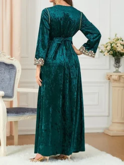 Women’s Casual Dress Velvet Dress Swing Dress Long Dress Maxi Dress Lace Embroidered Outdoor Christmas Daily Fashion Elegant V Neck Long Sleeve 2023 Loose Fit Dark Green Color M L XL XXL Size