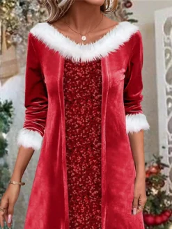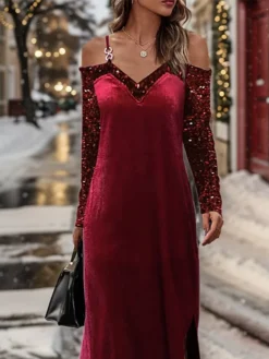 Women’s Christmas Dress Velvet Dress Casual Dress Midi Dress Sequins Patchwork Outdoor Christmas Daily Fashion Streetwear Strap Long Sleeve 2023 Regular Fit Wine Color S M L XL XXL Size