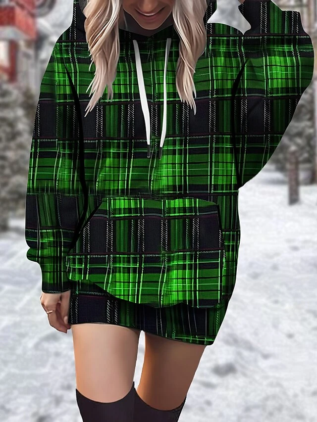 Women’s Casual Dress Christmas Dress Hoodie Dress Plaid Print Hooded Mini Dress Fashion Streetwear Outdoor Christmas Long Sleeve Loose Fit Wine Red Green Fall Winter S M L XL XXL