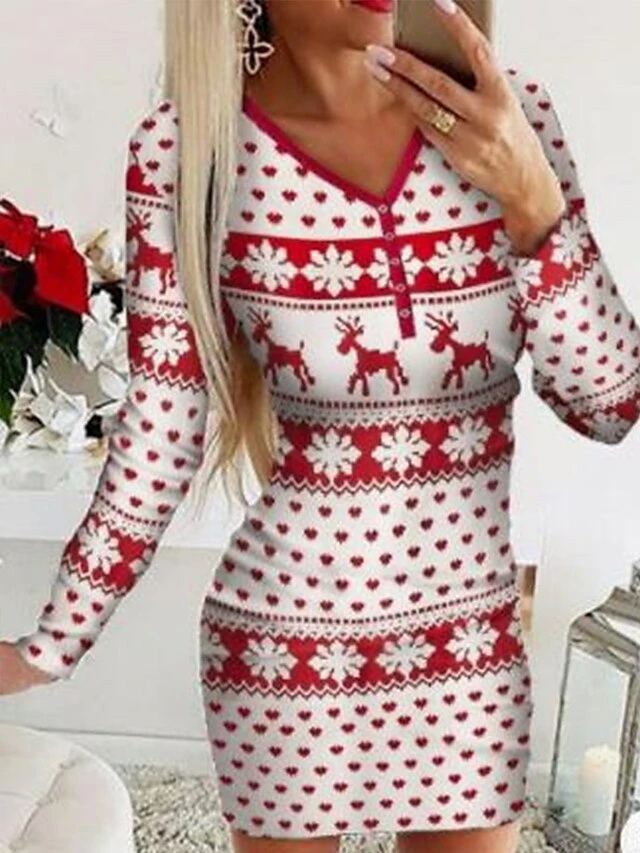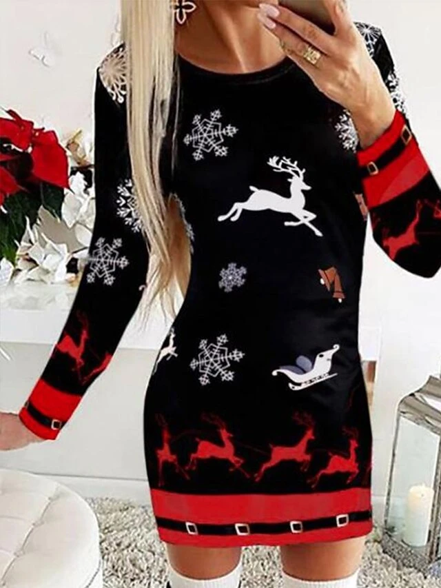 Women’s Casual Dress Christmas Dress Sheath Dress Christmas Tree Snowflake Print Crew Neck Mini Dress Active Fashion Outdoor Christmas Long Sleeve Regular Fit Black White Red Fall S M L XL XXL
