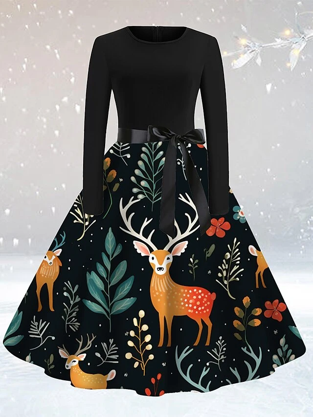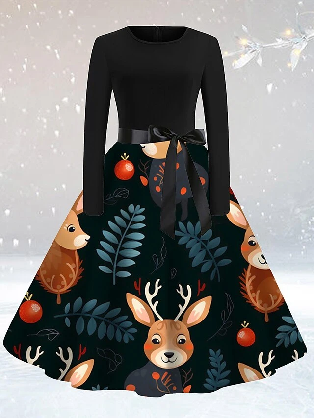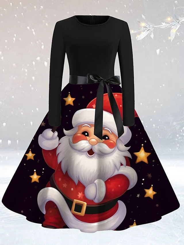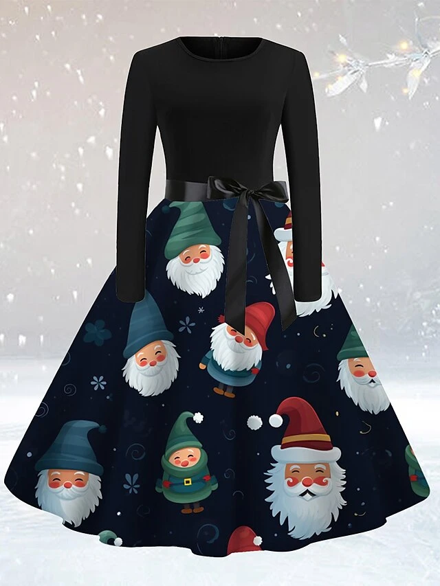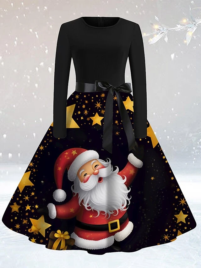 Women’s Casual Dress Christmas Dress Sheath Dress Santa Claus Christmas Tree Lace Up Print Crew Neck Midi Dress Active Fashion Outdoor Christmas Long Sleeve Loose Fit Yellow Red Blue Fall S M L XL XXL