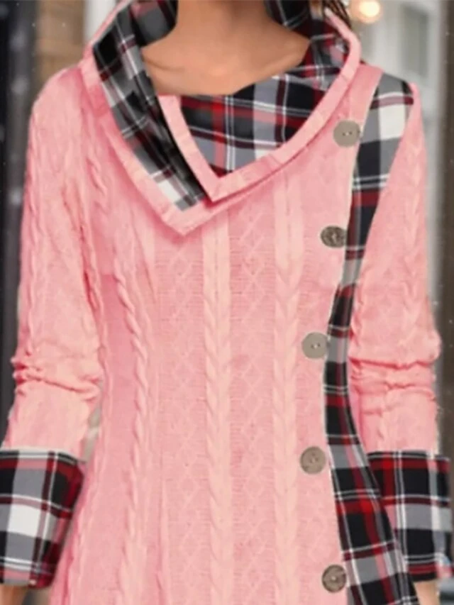 Women’s Casual Dress Christmas Dress Sweater Dress Plaid Button Fake Two Piece Cowl Neck Midi Dress Fashion Streetwear Outdoor Christmas Long Sleeve Regular Fit Pink Fall Winter S M L XL XXL