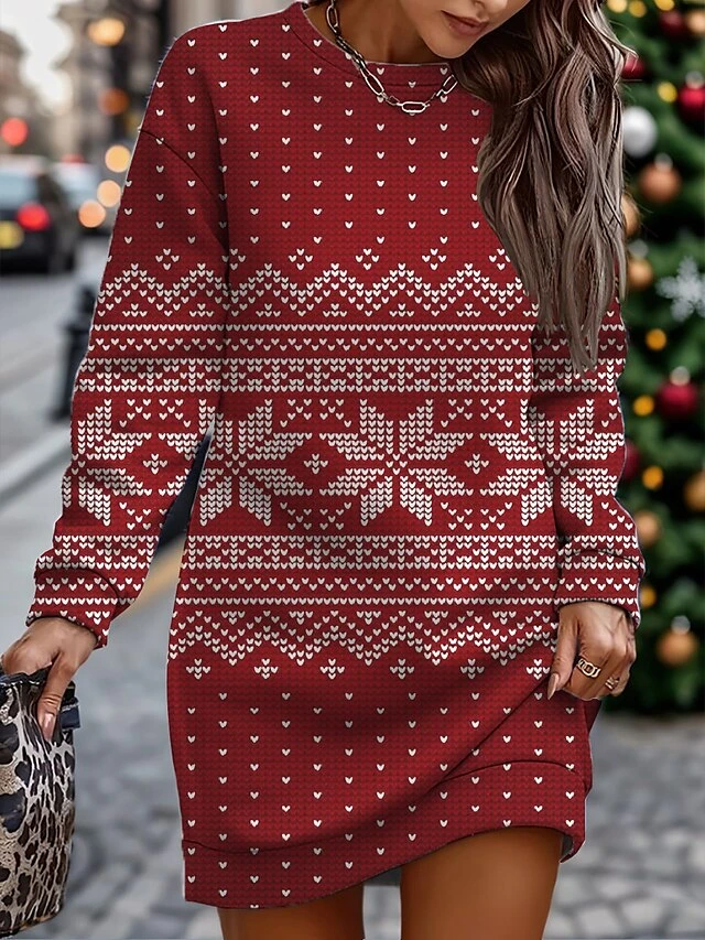 Women’s Casual Dress Christmas Dress Sweatshirt Dress Geometric Snowflake Print Crew Neck Mini Dress Fashion Streetwear Outdoor Christmas Long Sleeve Loose Fit Pink Wine Red Fall Winter S M L XL XXL