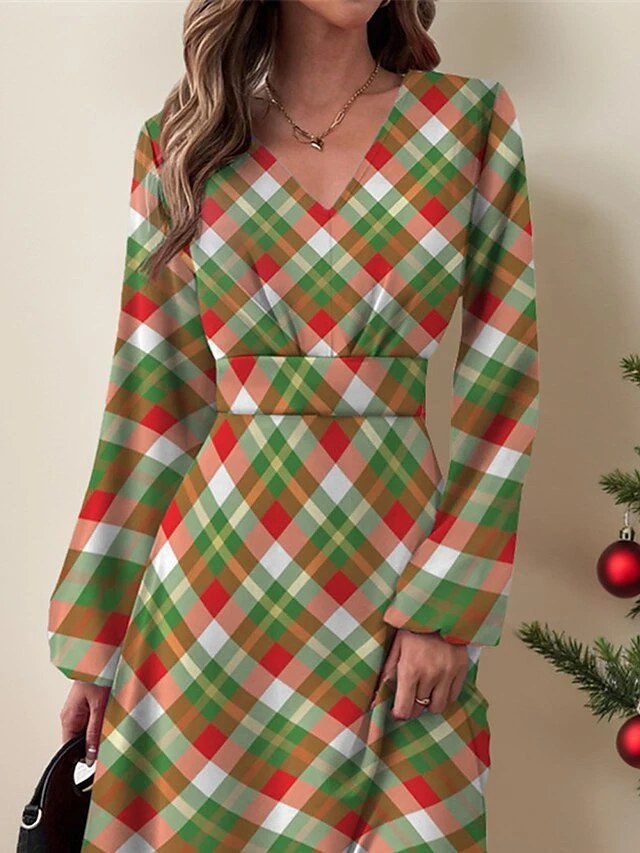 Women’s Casual Dress Christmas Dress Swing Dress Plaid Print V Neck Midi Dress Fashion Streetwear Outdoor Christmas Long Sleeve Regular Fit Green Fall Winter S M L XL XXL