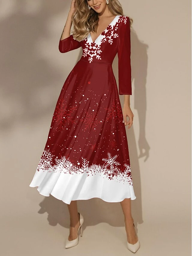Women’s Casual Dress Christmas Dress Swing Dress Snowflake Print V Neck Midi Dress Fashion Streetwear Outdoor Christmas 3/4 Length Sleeve Regular Fit Black Red Blue Fall Winter S M L XL XXL