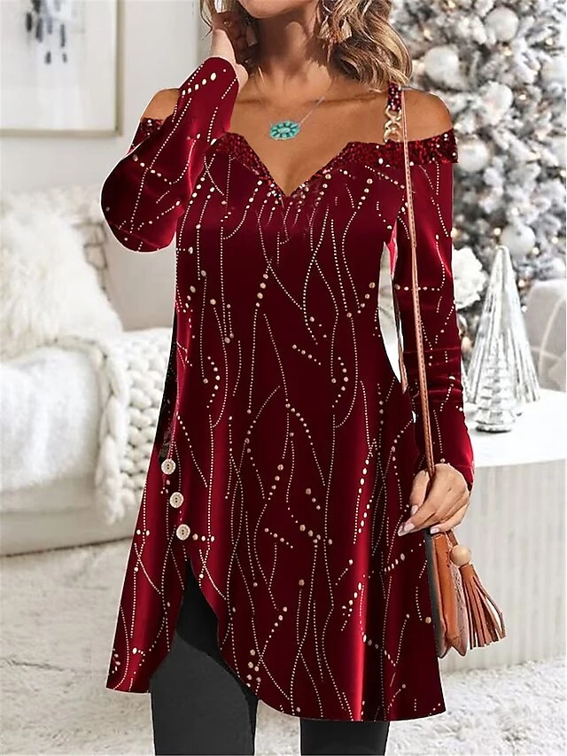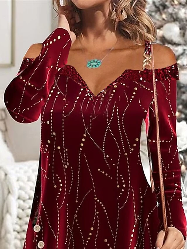 Women’s Casual Dress Christmas Dress Velvet Dress Geometric Sequins Button Strap Mini Dress Fashion Modern Outdoor Christmas Long Sleeve Regular Fit Wine Fall Winter S M L XL XXL