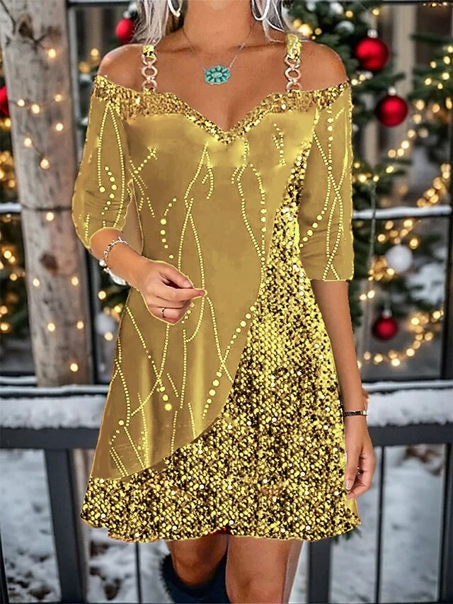 Women’s Casual Dress Christmas Dress Velvet Dress Geometric Sequins Patchwork Strap Mini Dress Fashion Streetwear Outdoor Christmas Long Sleeve Regular Fit Wine Gold Fall Winter S M L XL XXL