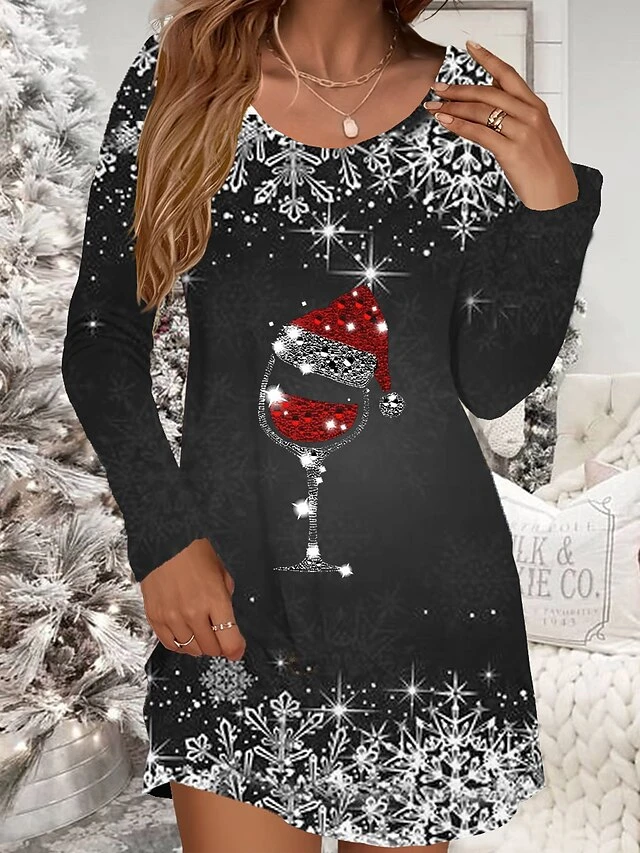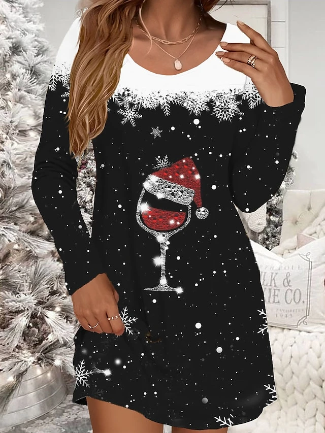 Women’s Casual Dress Christmas Dress Winter Dress Christmas Hat Print V Neck Mini Dress Fashion Streetwear Outdoor Christmas Long Sleeve Loose Fit Black White Gray Fall Winter S M L XL XXL