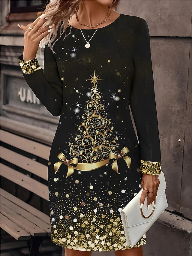Women’s Casual Dress Christmas Dress Winter Dress Christmas Tree Print Crew Neck Mini Dress Fashion Streetwear Outdoor Christmas Long Sleeve Loose Fit Silver Yellow Gold Fall Winter S M L XL XXL
