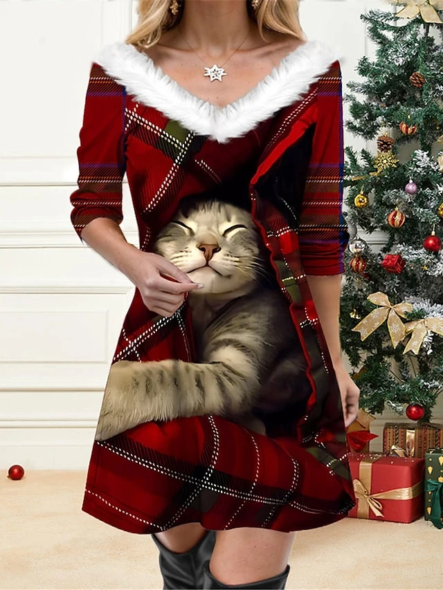 Women’s Casual Dress Christmas Dress Winter Dress Plaid Cat Print V Neck Mini Dress Active Fashion Outdoor Christmas Long Sleeve Regular Fit Wine Fall Winter S M L XL XXL