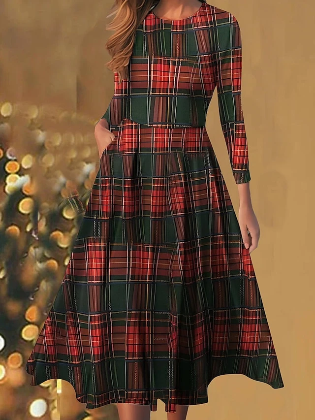 Women’s Casual Dress Christmas Dress Winter Dress Plaid Pocket Print Crew Neck Midi Dress Fashion Streetwear Outdoor Christmas Long Sleeve Regular Fit Red Fall Winter S M L XL XXL