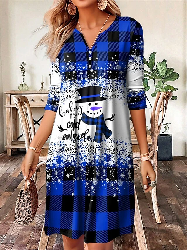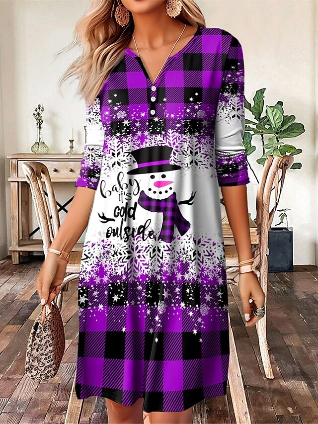 Women’s Casual Dress Christmas Dress Winter Dress Plaid Snowman Button Print Split Neck Mini Dress Fashion Streetwear Outdoor Christmas Long Sleeve Loose Fit Wine Blue Purple Fall Winter S M L XL XXL