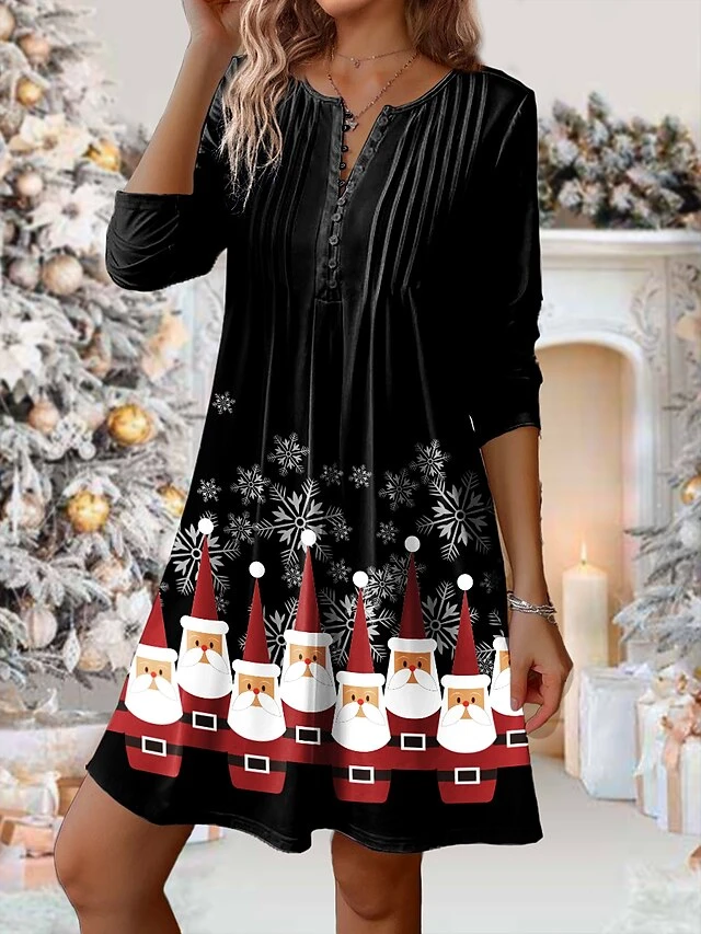 Women’s Casual Dress Christmas Dress Winter Dress Santa Claus Snowflake Button Print Crew Neck Midi Dress Fashion Streetwear Outdoor Christmas Long Sleeve Loose Fit Black Wine Blue Fall Winter S M L