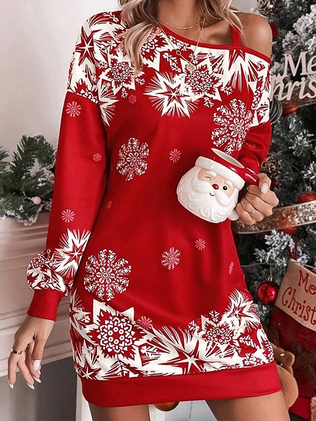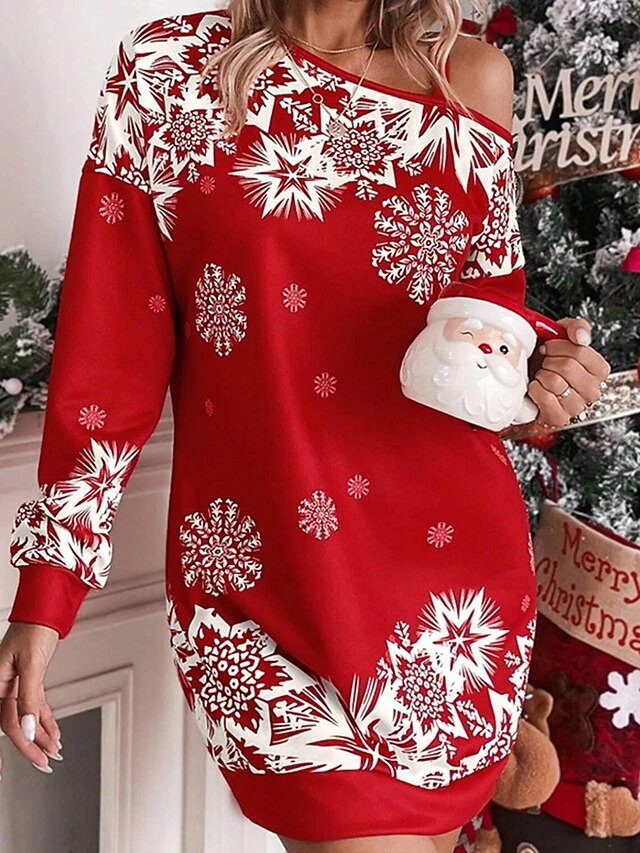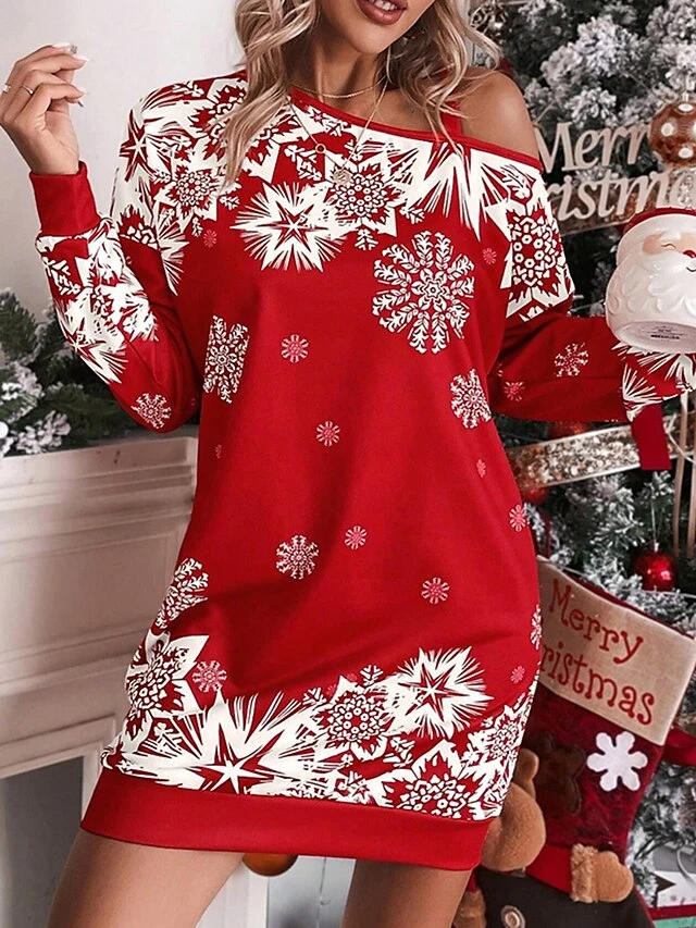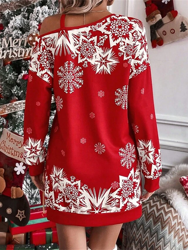 Women’s Casual Dress Christmas Dress Winter Dress Snowflake Cold Shoulder Print V Neck Mini Dress Active Fashion Outdoor Christmas Long Sleeve Loose Fit Red Fall Winter S M L XL