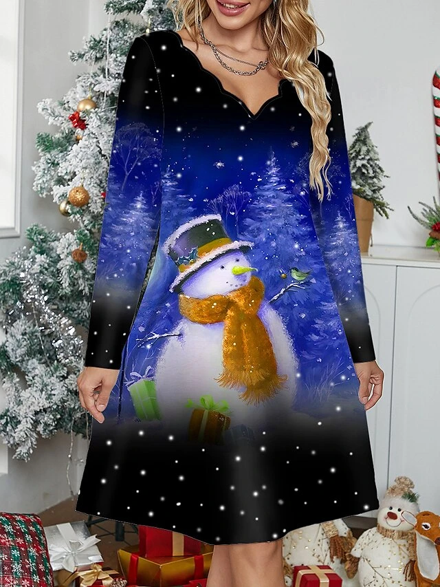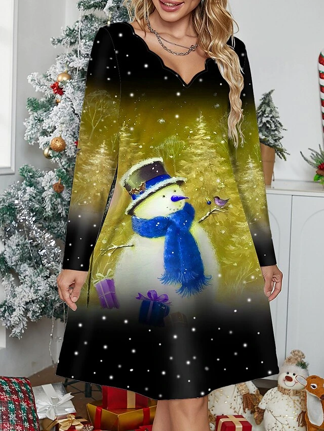 Women’s Casual Dress Christmas Dress Winter Dress Snowman Christmas Tree Print Scalloped Neck Mini Dress Fashion Streetwear Outdoor Christmas Long Sleeve Regular Fit Yellow Wine Blue Fall Winter S M