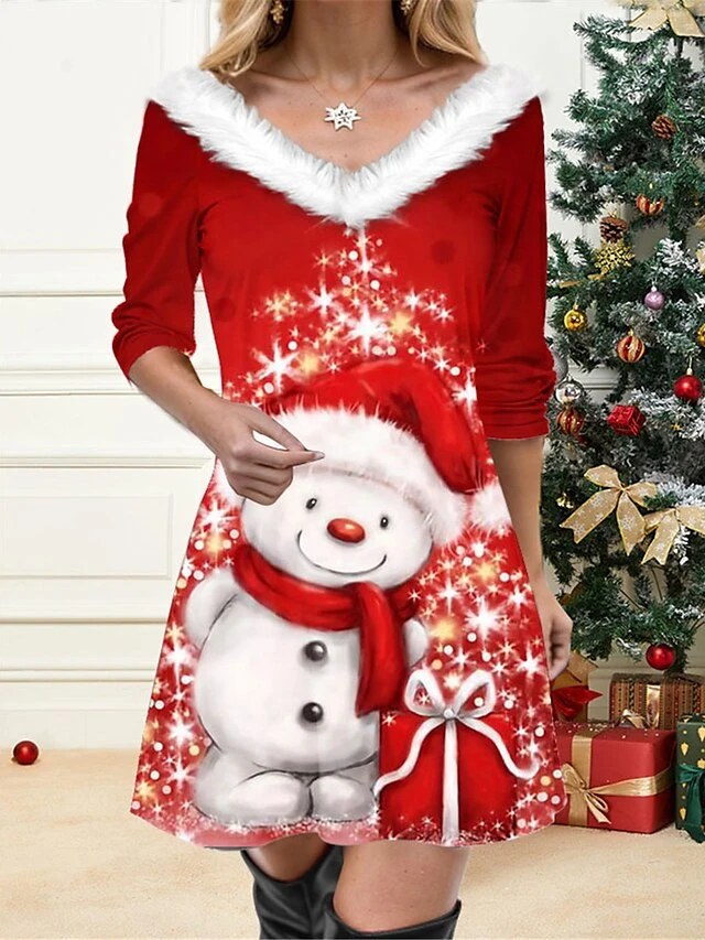 Women’s Casual Dress Christmas Dress Winter Dress Snowman Snowflake Print V Neck Mini Dress Active Fashion Outdoor Christmas Long Sleeve Regular Fit Wine Fall Winter S M L XL XXL