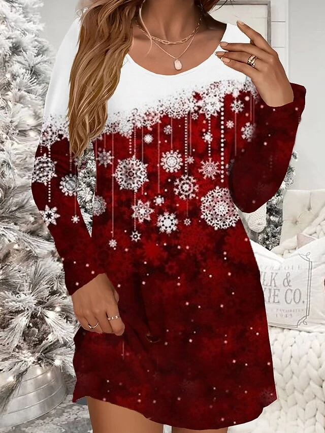 Women’s Casual Dress Christmas Dress Winter Dress Snowman Snowflake Print V Neck Mini Dress Fashion Streetwear Outdoor Christmas Long Sleeve Loose Fit White Dark Red Wine Fall Winter S M L XL XXL