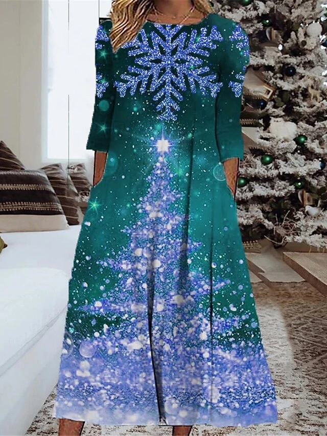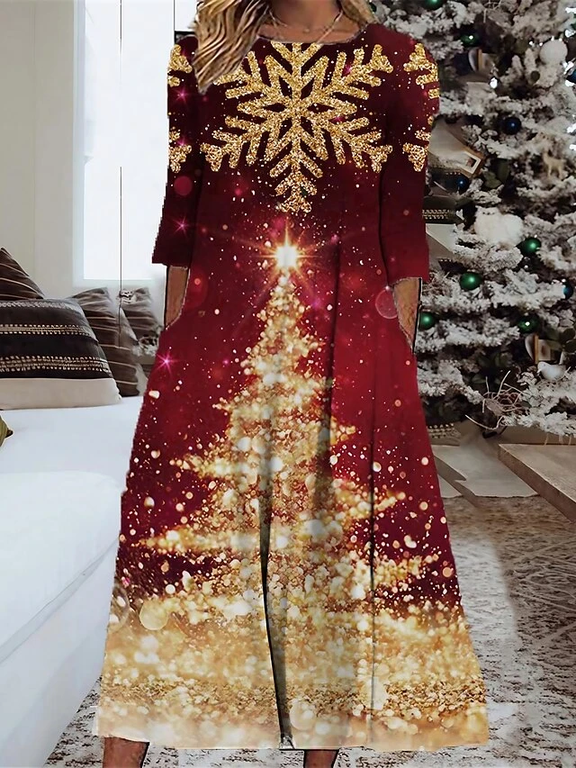 Women’s Casual Dress Shift Dress Midi Dress Midi Dress Wine Blue Green 3/4 Length Sleeve Christmas Tree Ruched Spring Fall Winter Round Neck Fashion Christmas 2023 S M L XL XXL 3XL 4XL 5XL