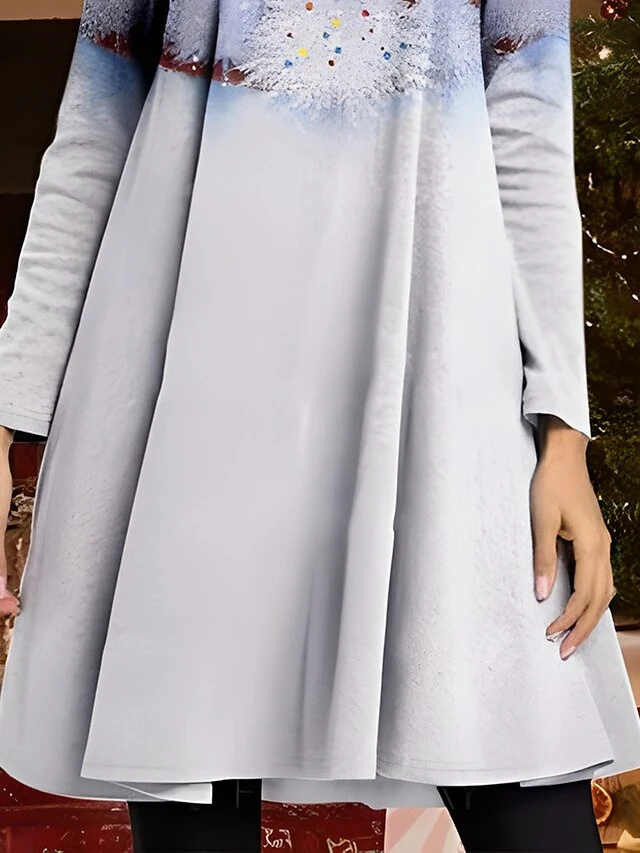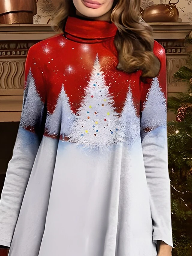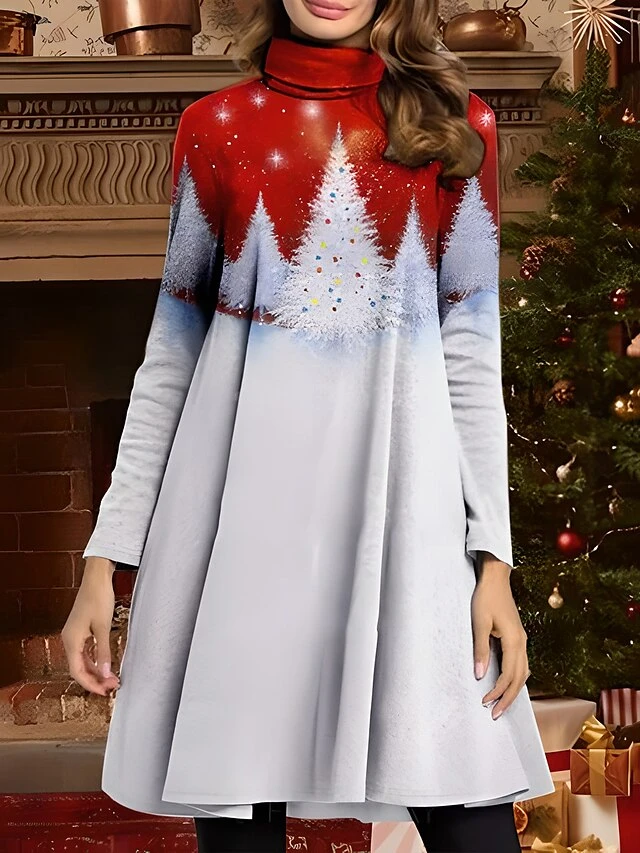 Women’s Casual Dress Winter Dress Swing Dress Christmas Tree Print Turtleneck Mini Dress Fashion Modern Outdoor Christmas Long Sleeve Regular Fit Red Fall Winter S M L XL XXL