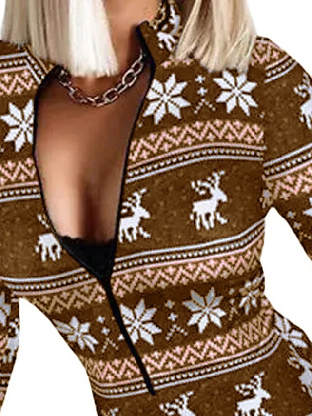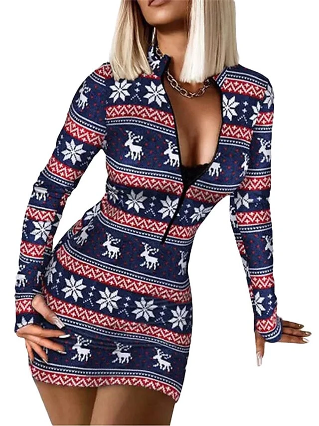 Women’s Christmas Casual Dress BodyconShort Mini Dress Dark Blue Red Brown Long Sleeve Geometric Elk Snowflake Zipper Print Fall Winter Stand Collar Casual Sexy 2022 S M L XL XXL 3XL