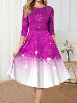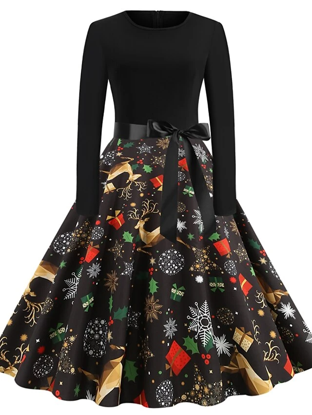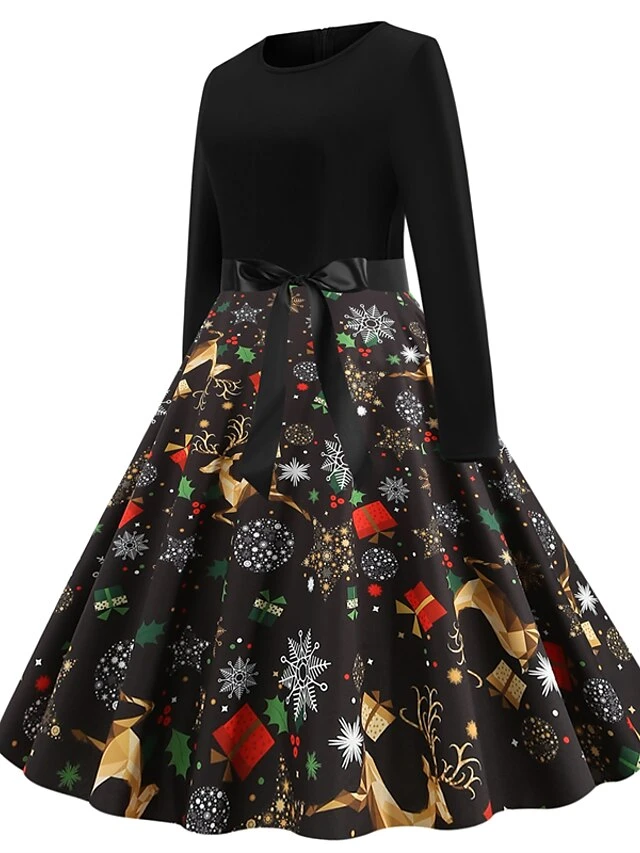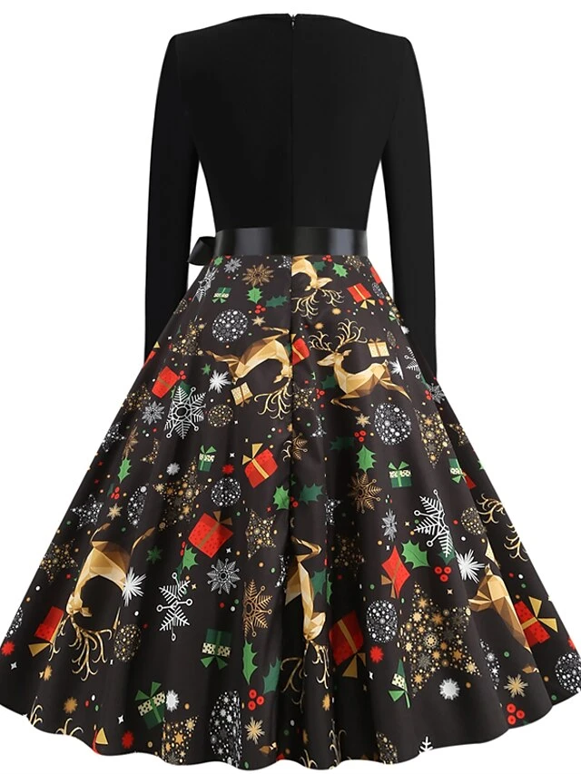 Women’s Christmas Casual Dress Knee Length Dress Black Long Sleeve SnowflakeTree Animal Bow Print Fall Winter Crew Neck Stylish Casual Modern 2022 S M L XL XXL