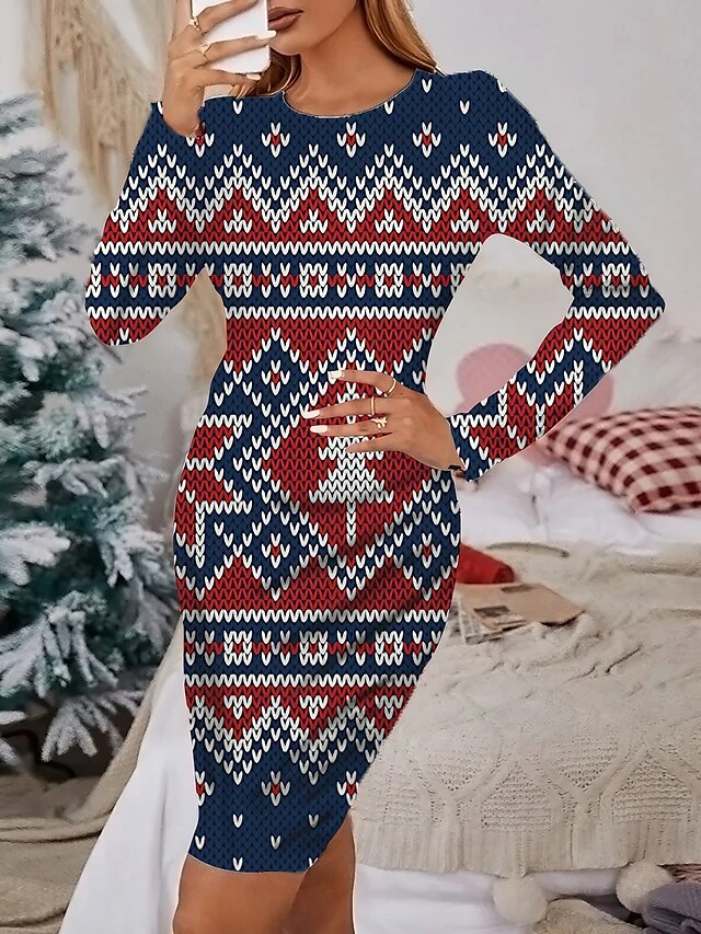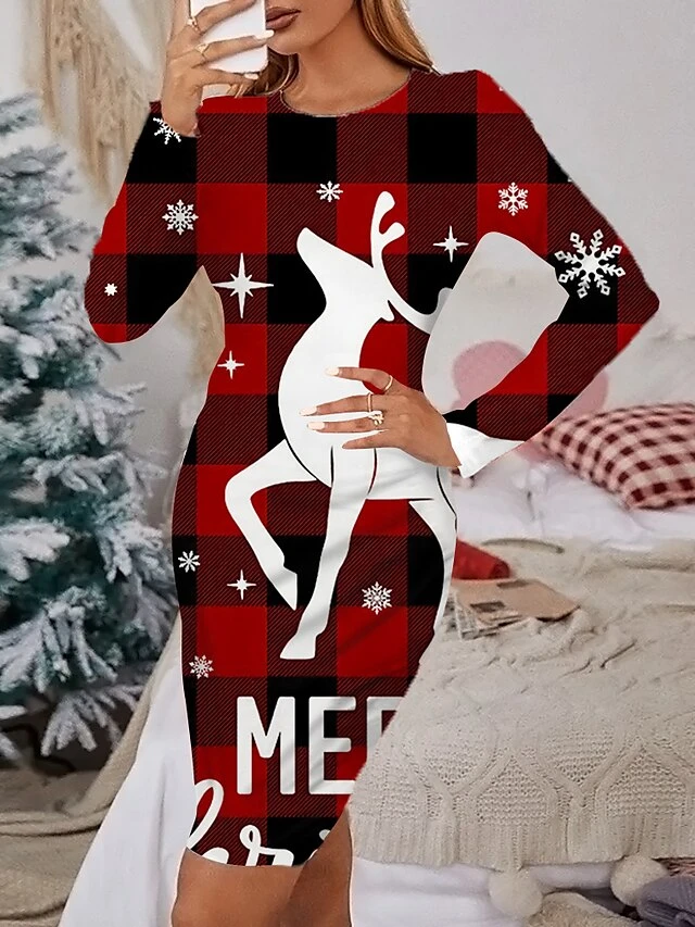 Women’s Christmas Casual Dress Print Dress Blue Wine Light Red Orange Red Long Sleeve ElkTree Snowflake Print Winter Autumn Crew Neck Fashion Casual Fall Dress 2022 S M L XL 2XL 3XL 4XL 5XL 6XL