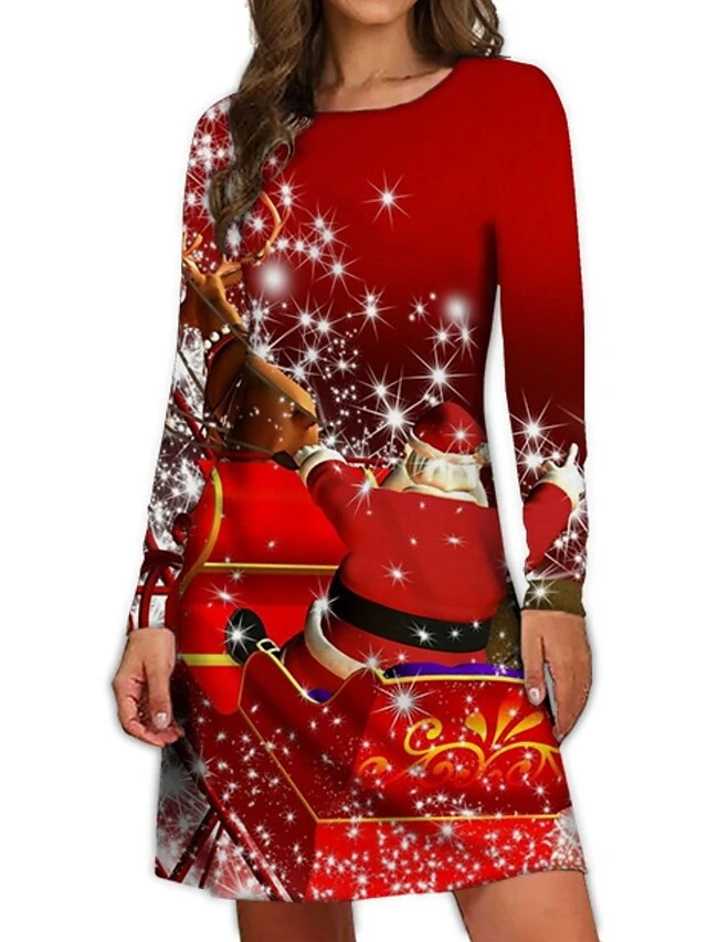Women’s Christmas Casual Dress Sheath Dress Mini Dress Blue Wine Dark Green Long Sleeve Santa Claus Print Winter Fall Autumn Crew Neck 2022 S M L XL 2XL 3XL
