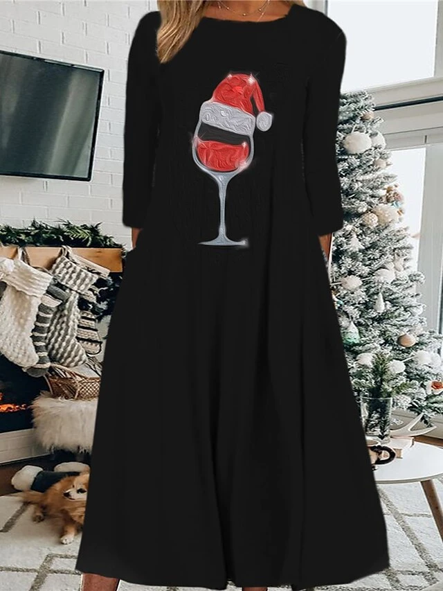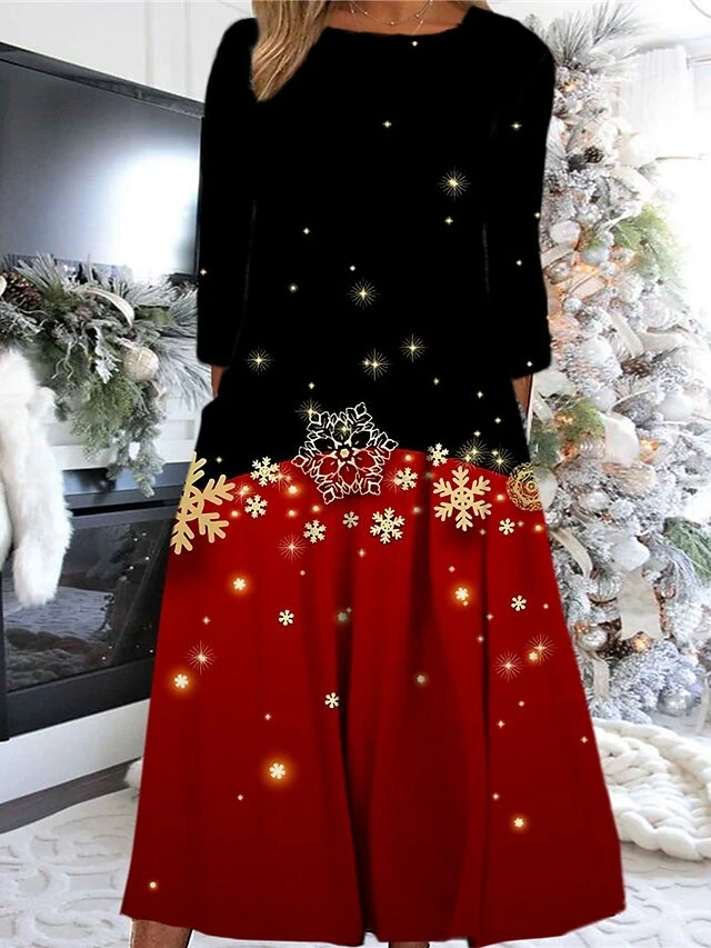 Women’s Christmas Casual Dress Shift Dress Midi Dress Midi Dress Black Wine Light Red 3/4 Length Sleeve Snowman Ruched Winter Fall Autumn Round Neck Fashion Daily 2022 S M L XL XXL 3XL
