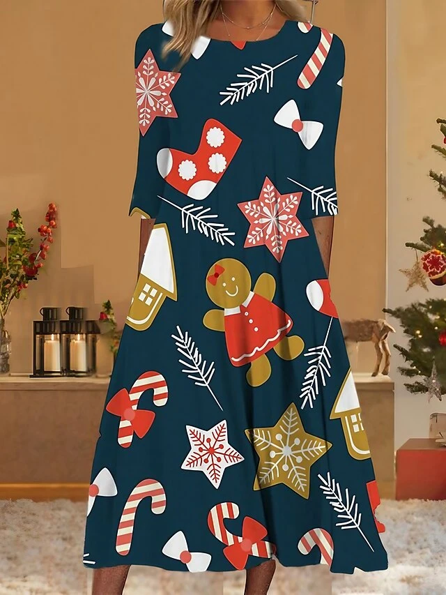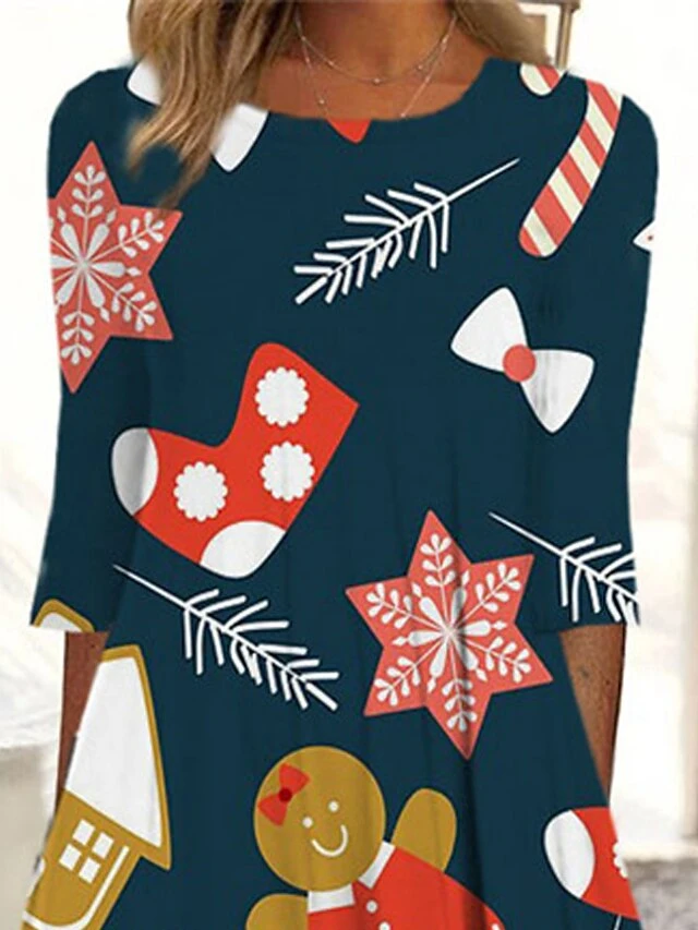 Women’s Christmas Casual Dress Shift DressMidi Dress Navy Blue 3/4 Length Sleeve Snowflake Ruched Print Fall Winter Round Neck Vacation Casual 2022 S M L XL XXL 3XL