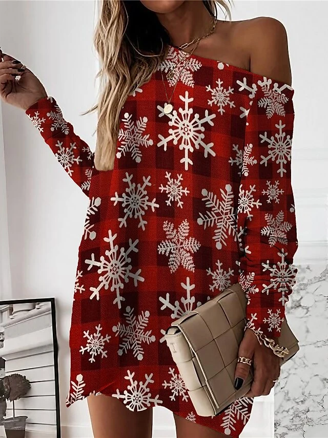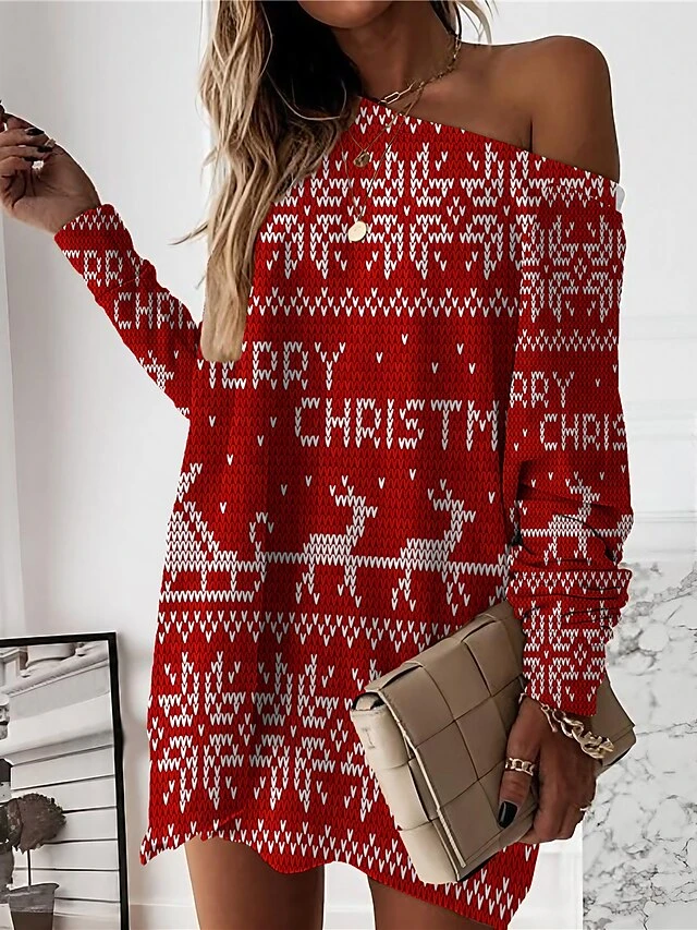 Women‘s Christmas Casual Dress Sweatshirt Dress Mini Dress Warm Fashion Outdoor Holiday Crew Neck Print Geometric Santa Claus Loose Fit White Rusty Red Red S M L XL XXL