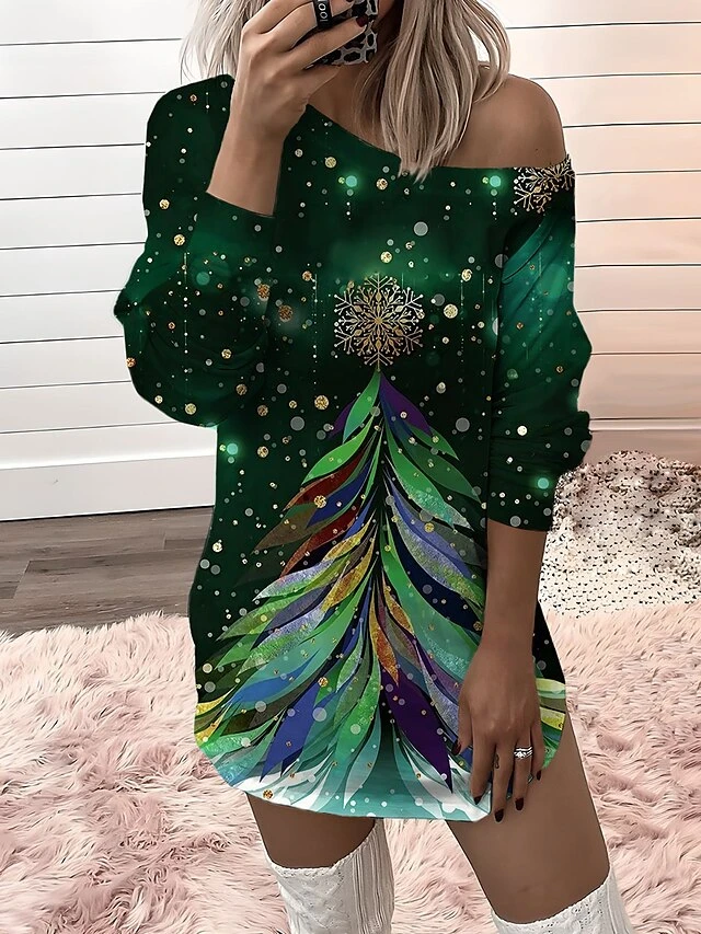 Women‘s Christmas Casual Dress Sweatshirt Dress Mini Dress Warm Fashion Outdoor Holiday Crew Neck Print Tree Loose Fit Black Blue Gold S M L XL XXL