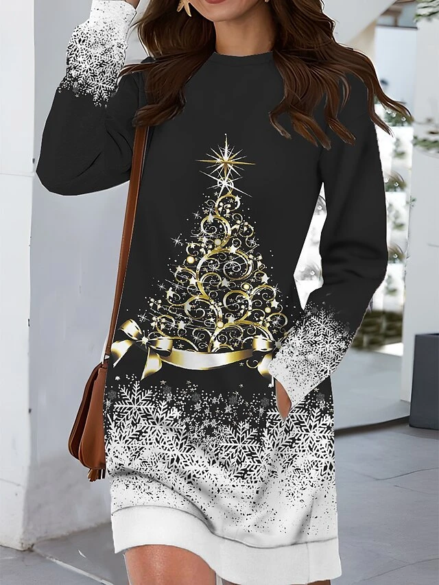 Women‘s Christmas Casual Dress Sweatshirt Dress Mini Dress Warm Fashion Outdoor Vacation Crew Neck Pocket Print Tree Loose Fit Black Red Brown S M L XL XXL