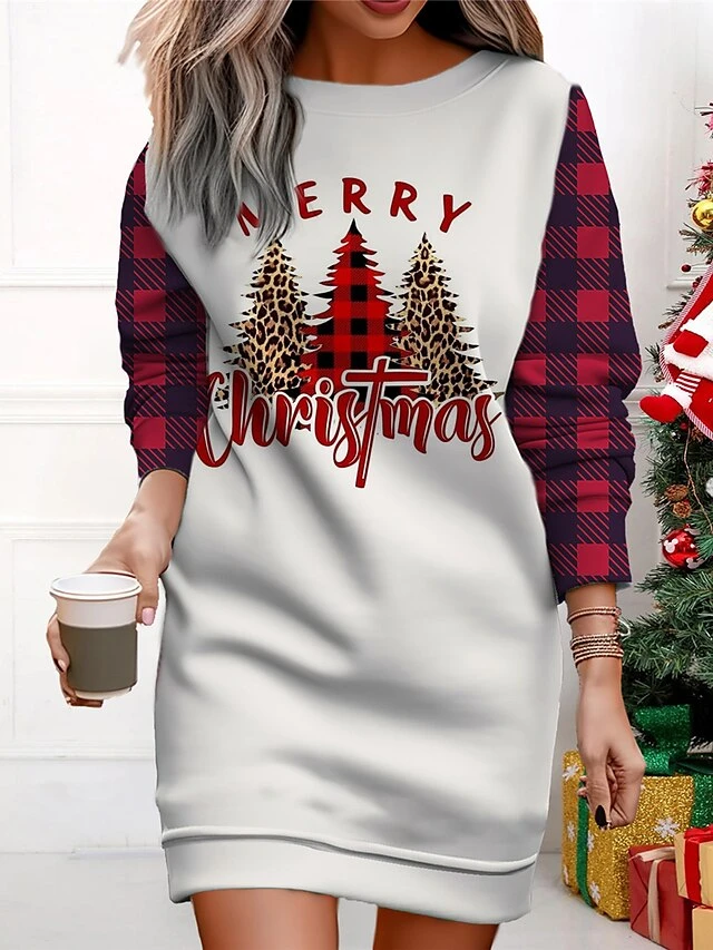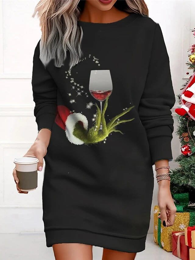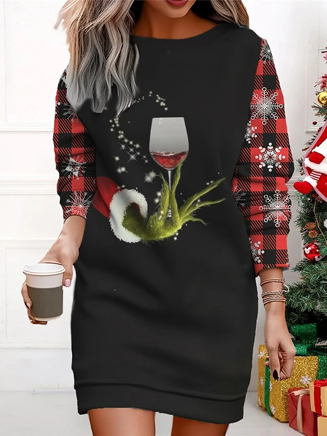 Women’s Christmas Casual Dress Sweatshirt Dress Mini Dress Warm Fashion Outdoor Vacation Crew Neck Print Geometric Christmas Tree Christmas Hat Loose Fit ArmyGreen Black Wine S M L XL XXL