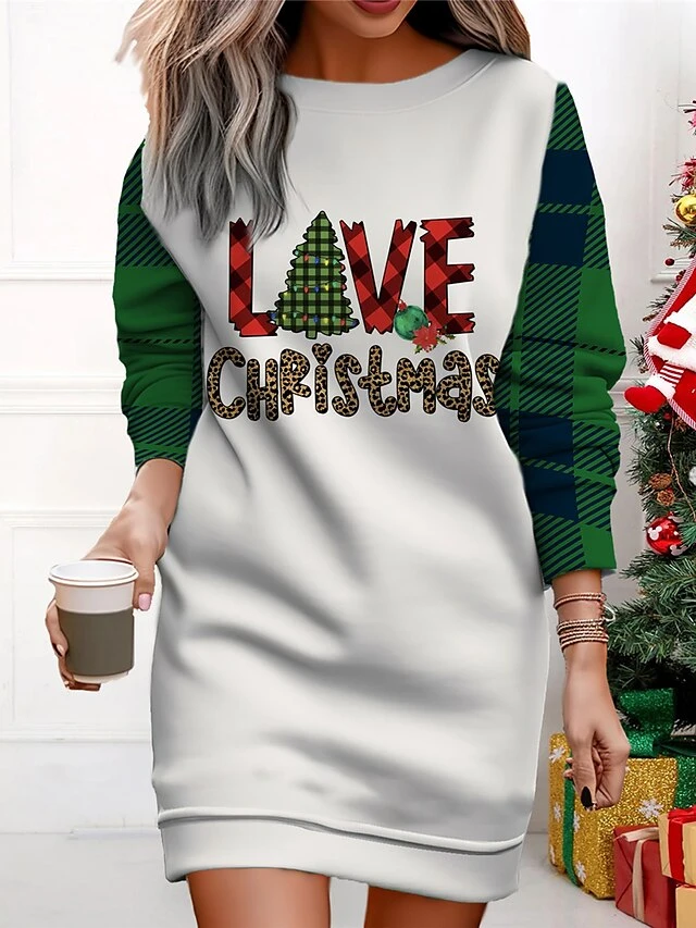 Women’s Christmas Casual Dress Sweatshirt Dress Mini Dress Warm Fashion Outdoor Vacation Crew Neck Print Santa Claus Christmas Tree Loose Fit ArmyGreen Wine Rusty Red S M L XL XXL