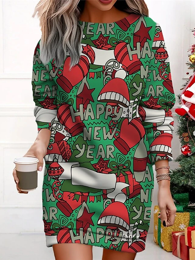 Women’s Christmas Casual Dress Sweatshirt Dress Mini Dress Warm Fashion Outdoor Vacation Crew Neck Print Santa Claus Snowman Christmas Tree Loose Fit ArmyGreen Black Red S M L XL XXL