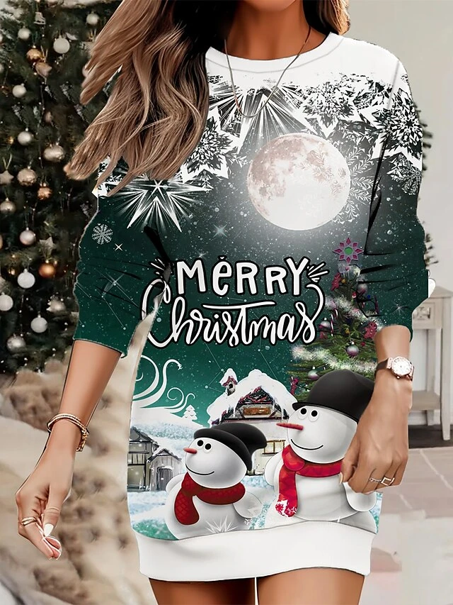 Women’s Christmas Casual Dress Sweatshirt Dress Mini Dress Warm Fashion Outdoor Vacation Crew Neck Print Snowman Christmas Tree Loose Fit Blue Sky Blue Green S M L XL XXL