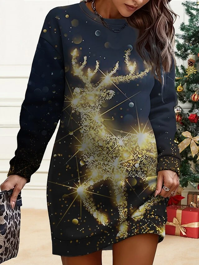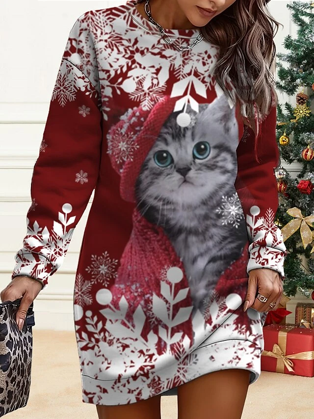 Women’s Christmas Casual Dress Sweatshirt Dress Mini Dress Warm Fashion OutdoorVacation Crew Neck Print Animal Snowman Snowflake Loose Fit Red Burgundy Navy Blue S M L XL XXL