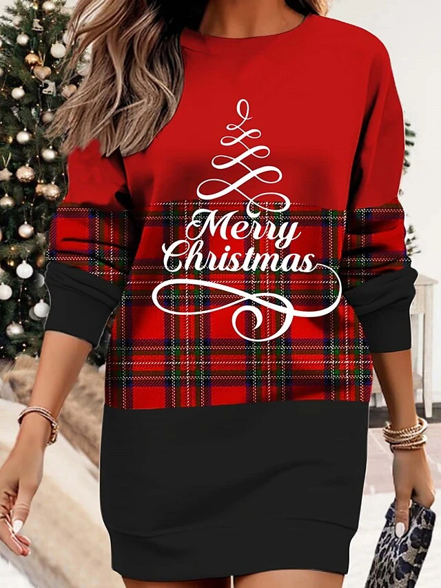 Women’s Christmas Casual Dress Sweatshirt Dress Mini Dress Warm Fashion OutdoorVacation Crew Neck Print GeometricTree Print Loose Fit Black White Wine S M L XL XXL
