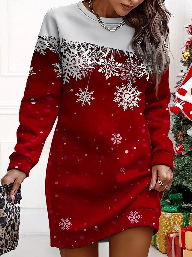 Women’s Christmas Casual Dress Sweatshirt Dress Mini Dress Warm Fashion OutdoorVacation Crew Neck Print Print Loose Fit Yellow Red Blue S M L XL XXL