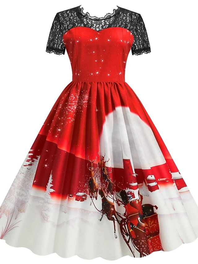 Women’s Christmas Casual Dress Swing Dress Midi Dress Blue Purple Red Short Sleeve Elk Print Lace Print Winter Fall Crew Neck Vacation Vintage 2022 S M L XL XXL 3XL
