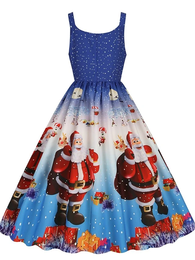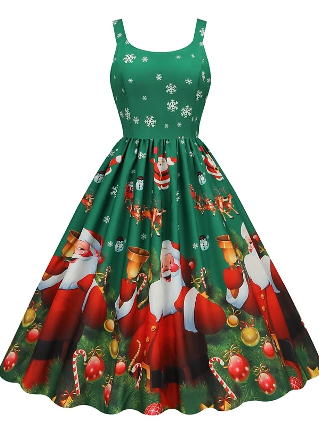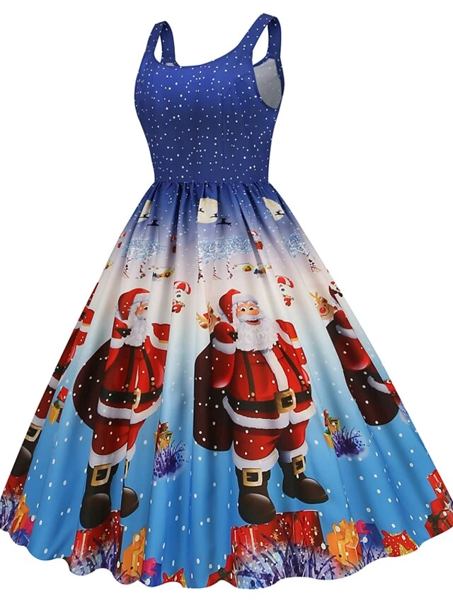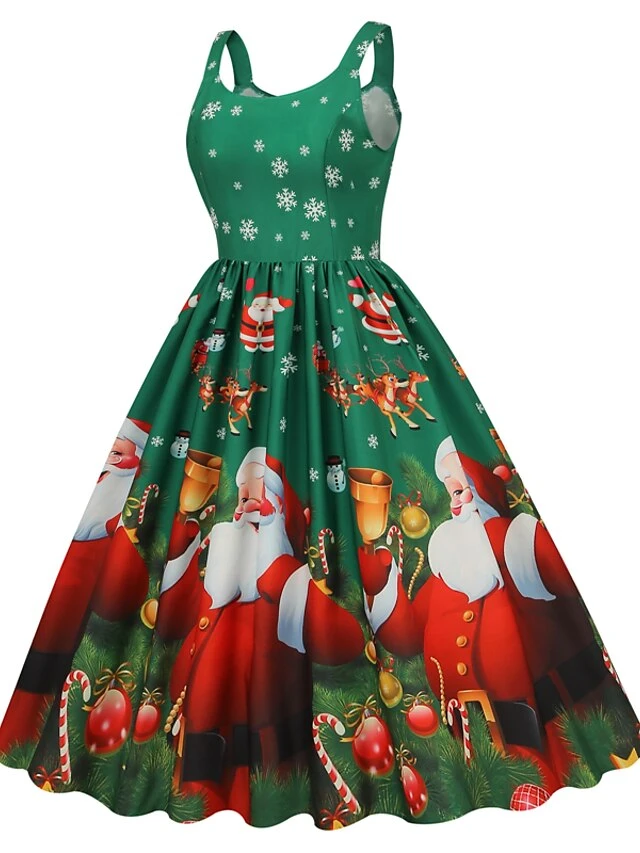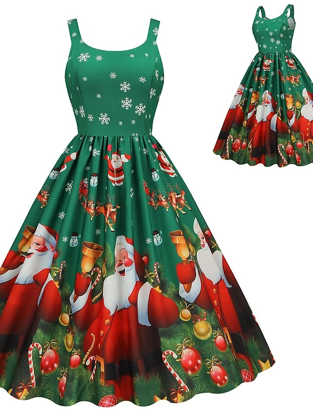 Women’s Christmas Casual Dress Swing Dress Midi Dress Green Blue Sleeveless Santa Claus Print Winter Fall Spaghetti Strap Vacation Vintage 2022 S M L XL XXL / Slip Dress