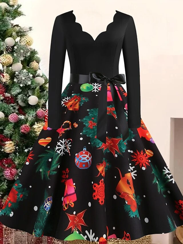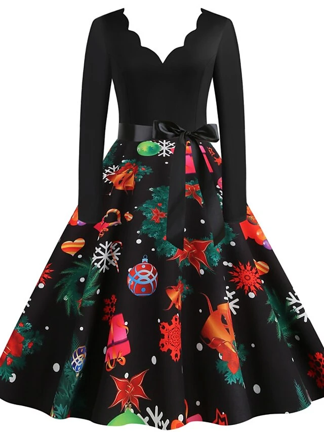 Women’s Christmas Casual Dress Swing Dress Vintage Dress Midi Dress Black Wine Orange Long Sleeve Animal Bow Winter Fall Autumn V Neck 2022 S M L XL XXL 3XL