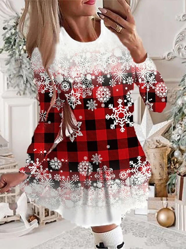 Women’s Christmas Casual Dress Swing DressShort Mini Dress Red Long Sleeve Plaid Snowflake Print Fall Winter Round Neck Vacation Casual 2022 S M L XL 2XL 3XL 4XL 5XL 6XL