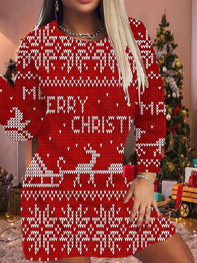 Women’s Christmas Casual Dress T Shirt Dress Tee Dress Mini Dress Blue Gold Red Long Sleeve Elk Print Snowflake Patchwork Print Winter Fall Crew Neck Casual Classic Daily 2022 S M L XL 2XL 3XL 4XL