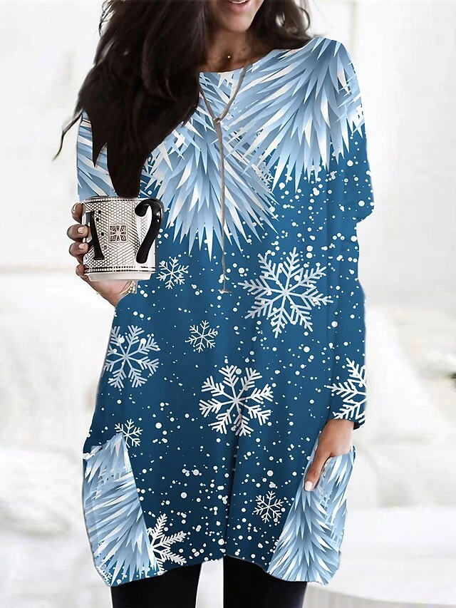 Women’s Christmas Casual Dress T Shirt Dress Tee Dress Mini Dress Blue Long Sleeve Snowflake Pocket Print Winter Fall Crew Neck Vacation Casual 2022 S M L XL XXL 3XL