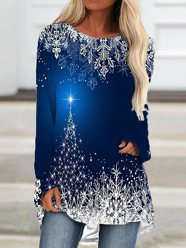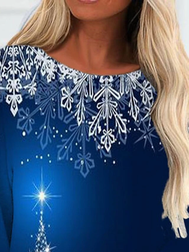 Women’s Christmas Casual Dress T Shirt Dress Tee Dress Mini Dress Blue Long Sleeve Snowflake Print Winter Fall Crew Neck Vacation Casual 2022 S M L XL XXL 3XL