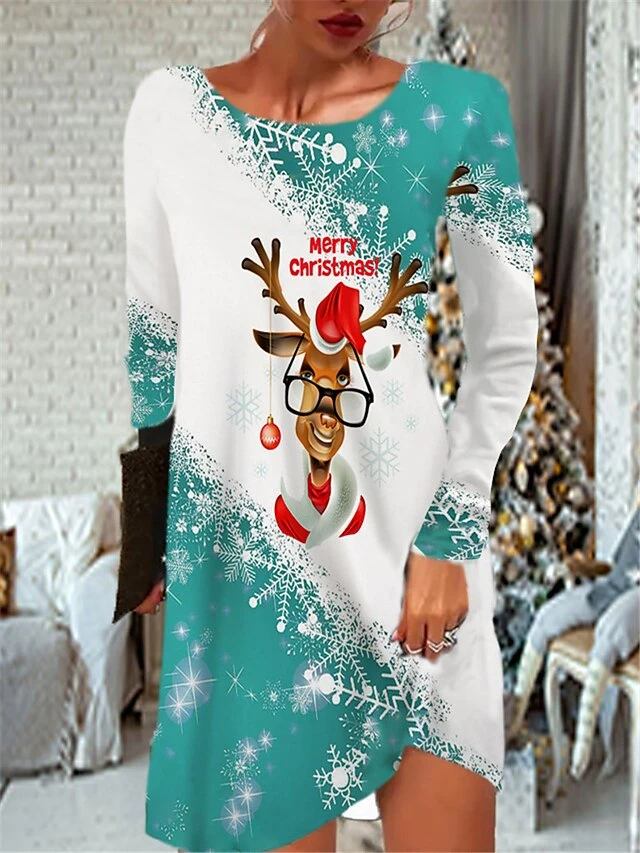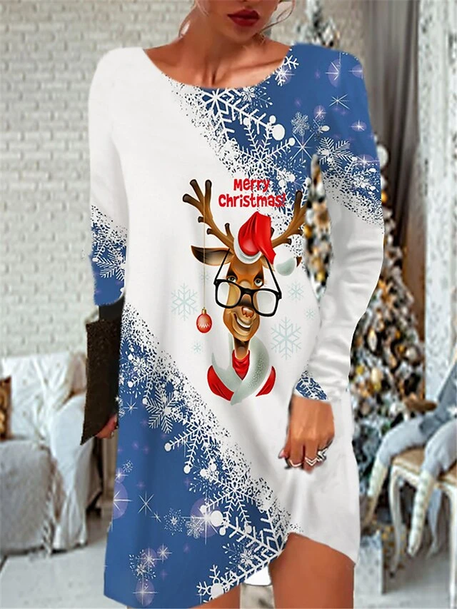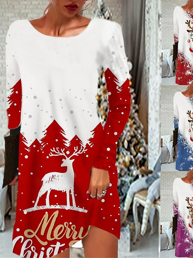 Women’s Christmas Casual Dress T Shirt Dress Tee Dress Mini Dress Blue Purple Light Red Light Blue White Long Sleeve Letter Elk Snowflake Pocket Print Winter Fall Crew Neck Vacation Casual 2022 S M L
