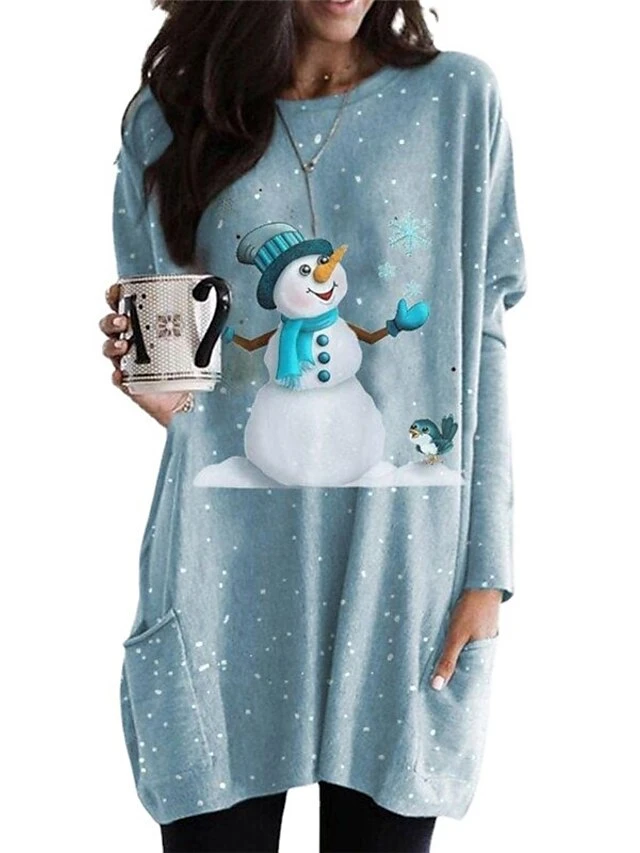 Women’s Christmas Casual Dress T Shirt Dress Tee Dress Shift Dress Mini Dress Blue Long Sleeve Snowman Pocket Winter Fall Autumn Crew Neck Fashion Daily Date Loose Fit 2022 XS S M L XL XXL 3XL 4XL 5XL