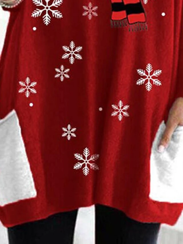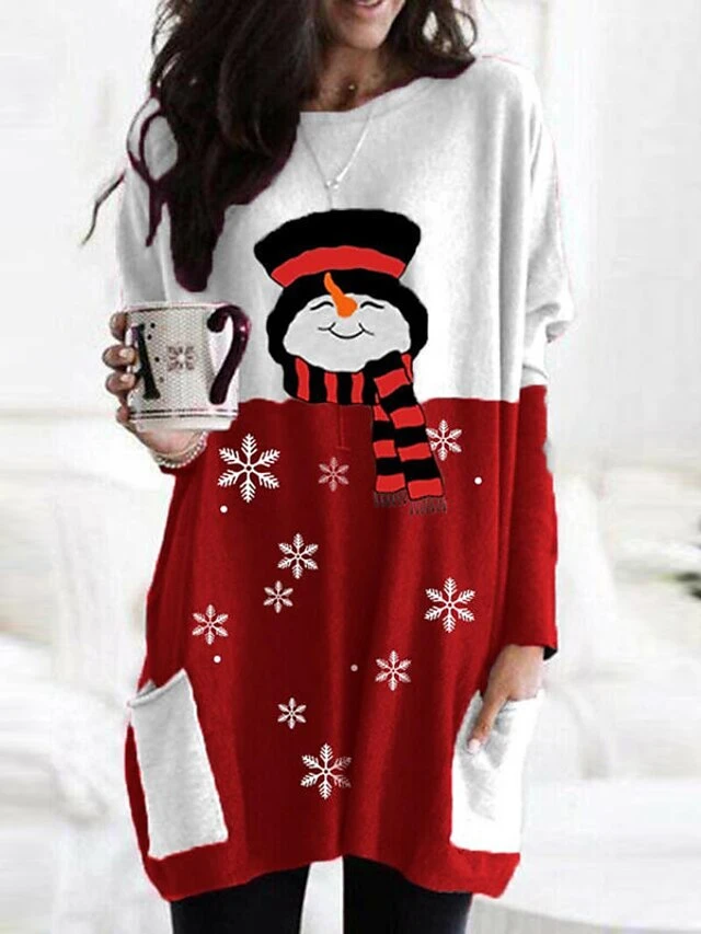 Women’s Christmas Casual Dress T Shirt Dress Tee Dress Shift Dress Mini Dress Wine Long Sleeve Snowman Pocket Winter Fall Autumn Crew Neck Vacation Loose Fit 2022 S M L XL XXL 3XL / Print