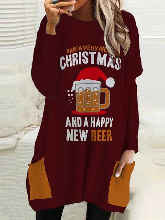 Women’s Christmas Casual Dress T Shirt Dress Tee Dress Shift Dress Mini Dress Wine Red Long Sleeve Letter Pocket Winter Fall Autumn Crew Neck Fashion Daily Vacation Loose Fit 2022 S M L XL XXL 3XL